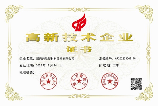 紹興興欣新材料股份有限公司成立于2002年06月27日,占地面積122畝,位于杭州灣上虞經濟技術開發(fā)區(qū)拓展路2號,現(xiàn)有職工200余人,專業(yè)技術人員50余人;博士、碩士研究生30余人組成的一支知識型、專業(yè)化的技術科研團隊。公司面向全球市場,專業(yè)開發(fā)電子化學品、環(huán)保化學品、醫(yī)藥中間體、高分子材料等先進新材料重點領域的省級科技型企業(yè);建有浙江上虞、安徽東至兩個生產基地。目前為“國家高新技術企業(yè)”、浙江省“隱形冠軍”企業(yè)、浙江省專精特新中小企業(yè);建有“省級”研究開發(fā)中心,共建天津大學浙江紹興研究院電子化學品研發(fā)中心。